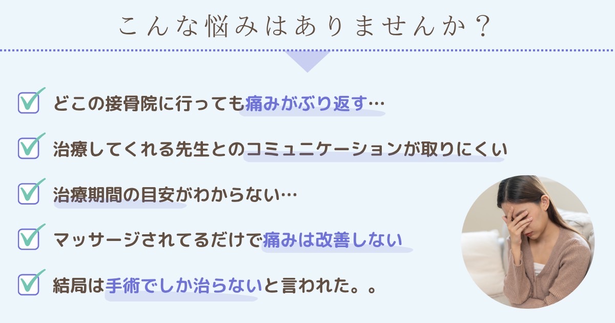 神経痛の症状や、骨盤~骨格の歪み方は一人ひとり違いがございます。当院では、腰椎ヘルニア・脊柱管狭窄症の数多くお悩みを